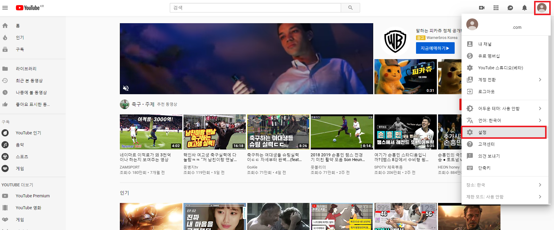 step2) 유튜브 접속 > 왼쪽 상단 계정 아이콘 (하단 이미지 빨간 네모박스) 클릭 후 펼쳐진 메뉴에서 설정 클릭